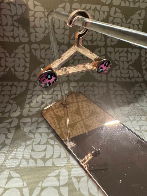 Estos pendientes redondos presentan un vibrante y atrevido diseño de animal print en tonos de rosa fucsia y turquesa sobre un fondo negro. La combinación de colores es llamativa y actual, perfecta para quienes desean expresar su personalidad a través de sus accesorios.