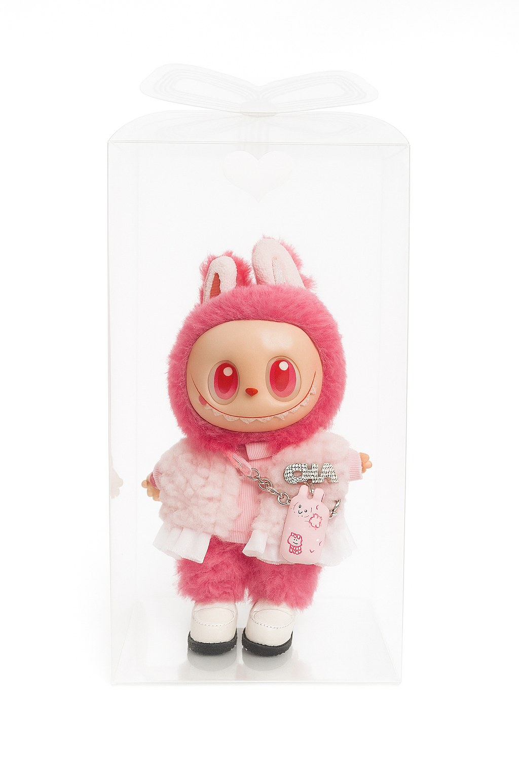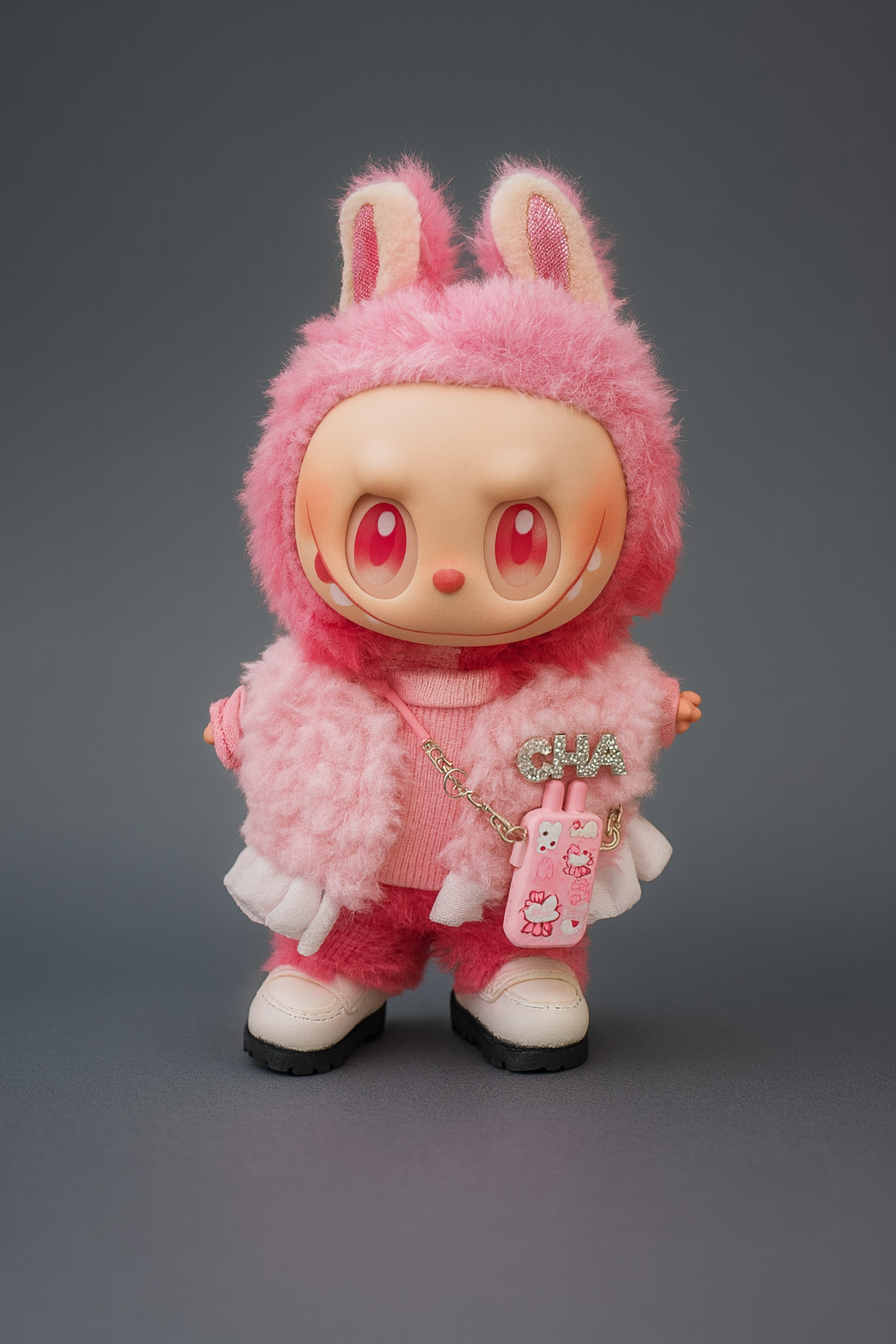 Muñeca con chaleco rosa y movil