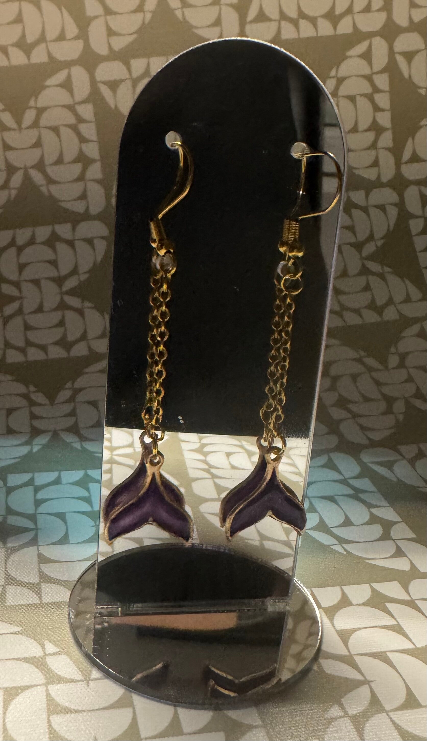 Pendientes largos con cadena dorada y colgante en forma de cola de sirena en tono morado con bordes dorados. Un diseño elegante y original que combina fantasía y estilo, perfecto para quienes buscan un accesorio único y llamativo.