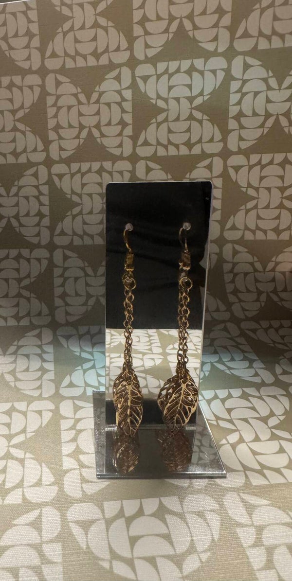 Elegantes pendientes colgantes con diseño de hoja en tono dorado, perfectos para añadir un toque natural y sofisticado a tu look. Su acabado metálico brillante y el delicado calado en forma de nervaduras hacen que resalten con cualquier estilo, desde el más casual hasta el más formal.