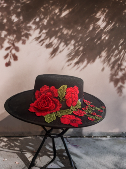 Conjunto de flamenca compuesto por sombrero negro, hombreras y bolsito con flores y flecos. Colores personalizados. Talla de niño a partir de 3 años.